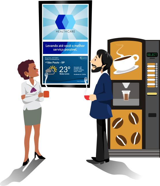 Instale uma tela de TV na recepção da sua empresa e diminua o tempo de espera percebido. Exiba notícias, apresente seus casos de sucesso, diferenciais da empresa, testemunhais de clientes satisfeitos, linha de produtos e serviços para entreter seu convidado enquanto aumenta suas chances de negócios.